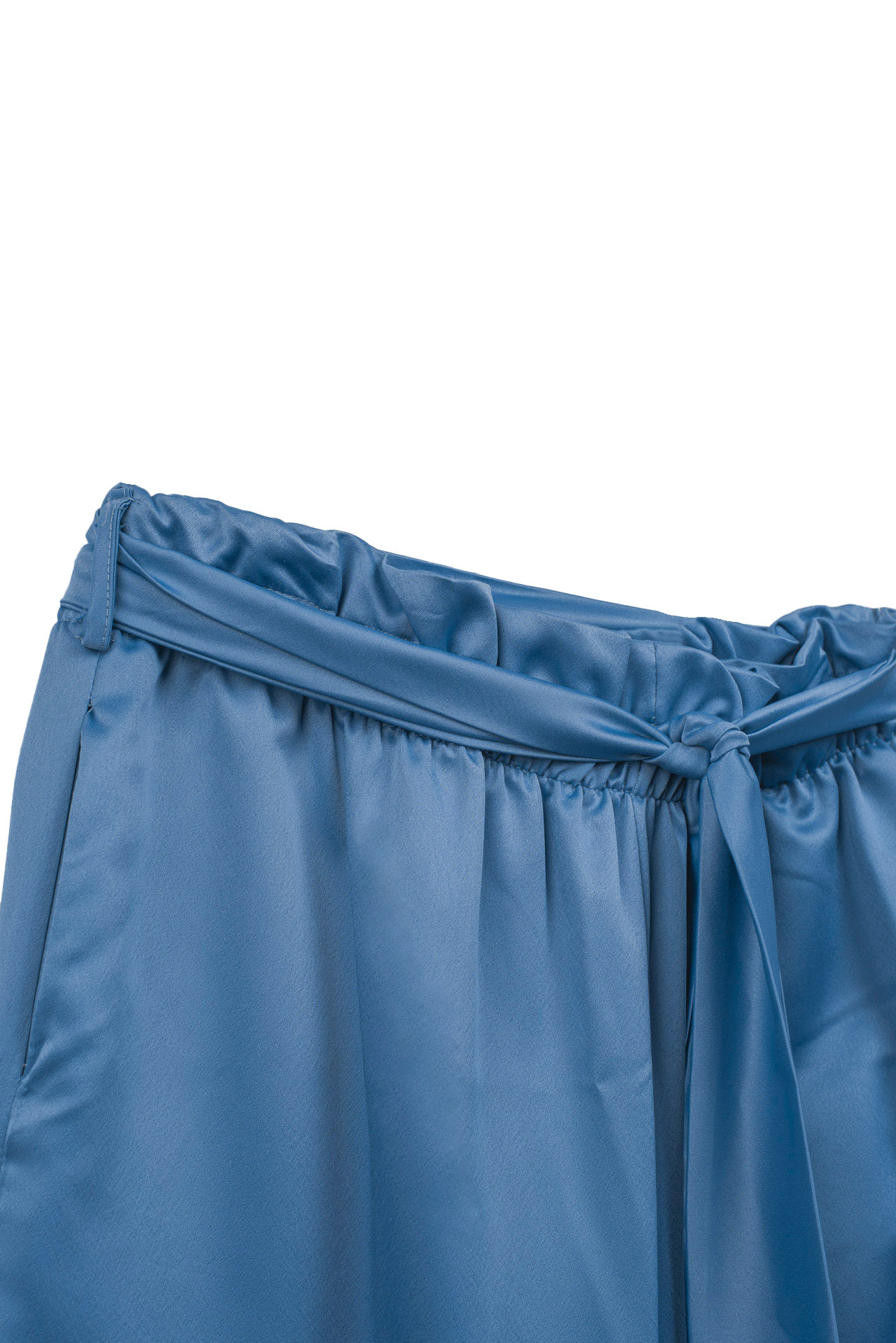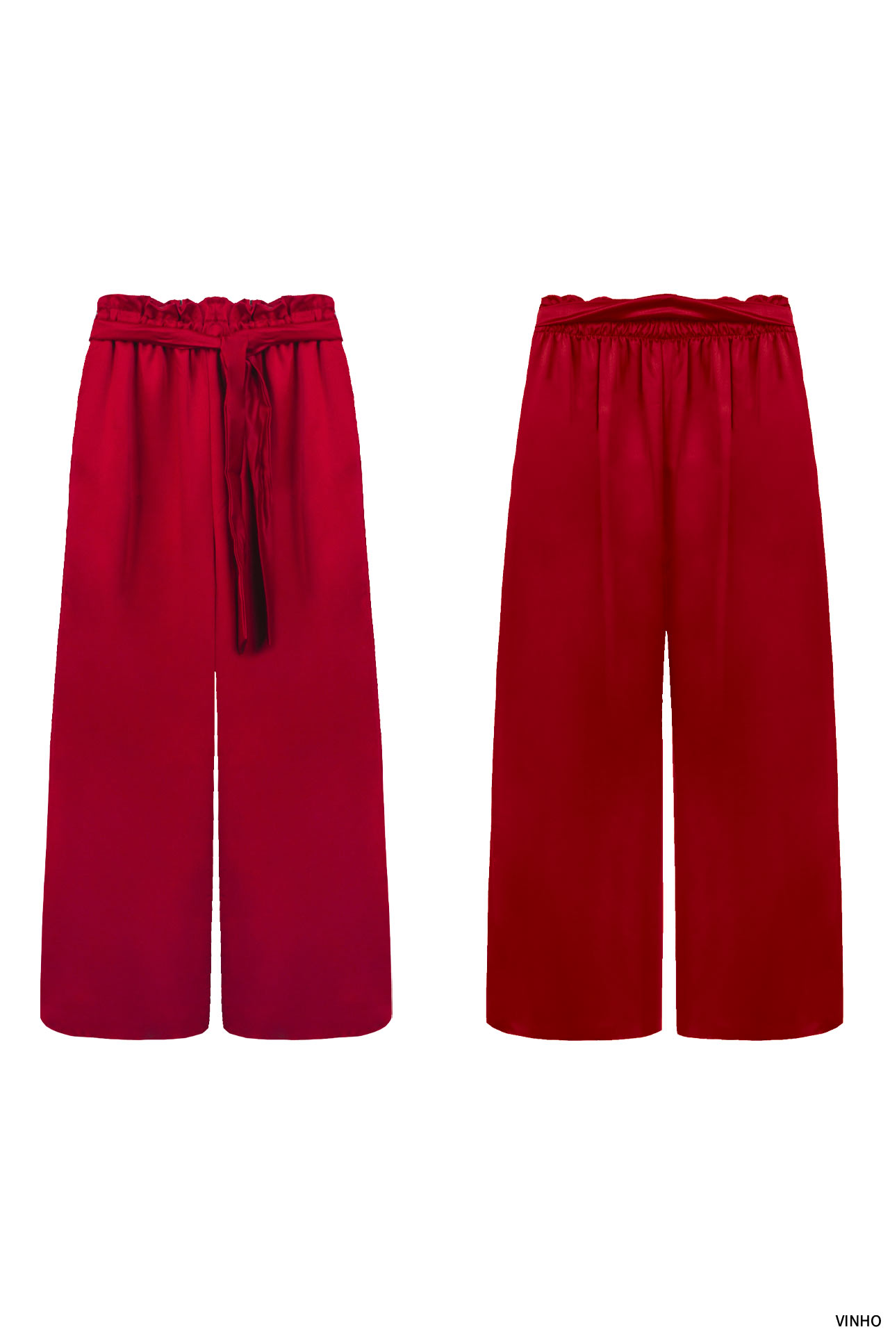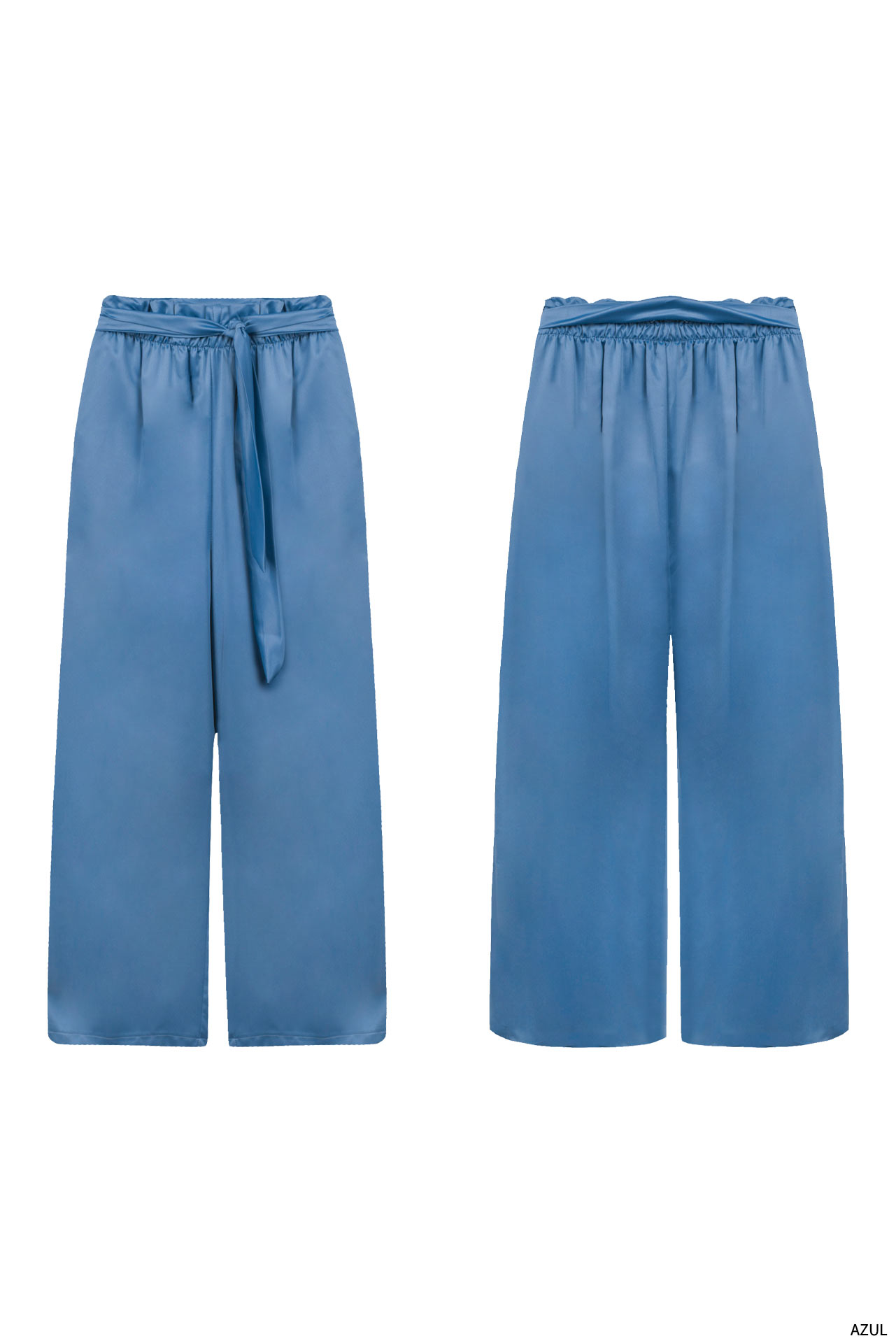 Calças de cintura subida elástica com efeito paperbag. Cinto de atar no mesmo tecido. Bolsos laterais. Corte de perna direita. Várias cores.