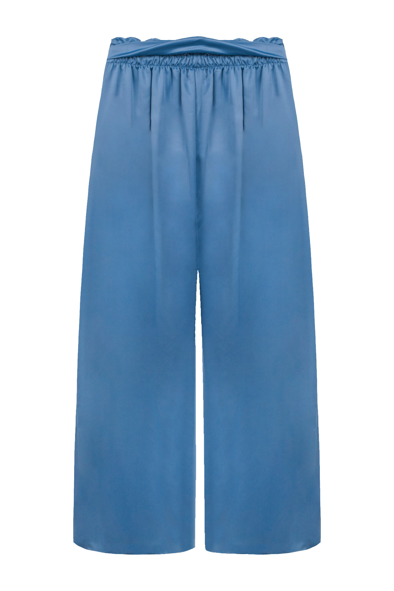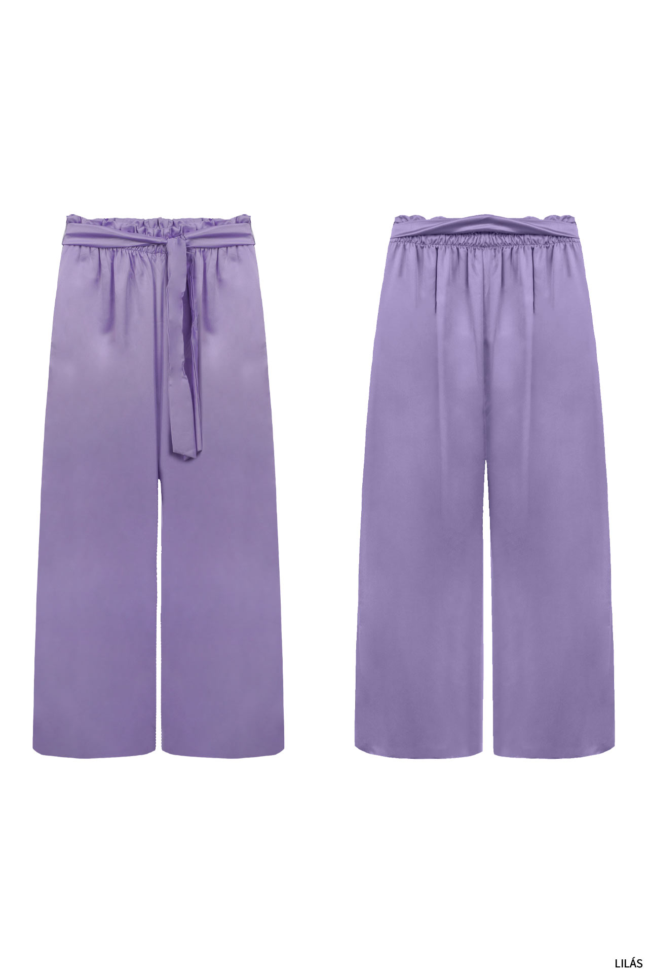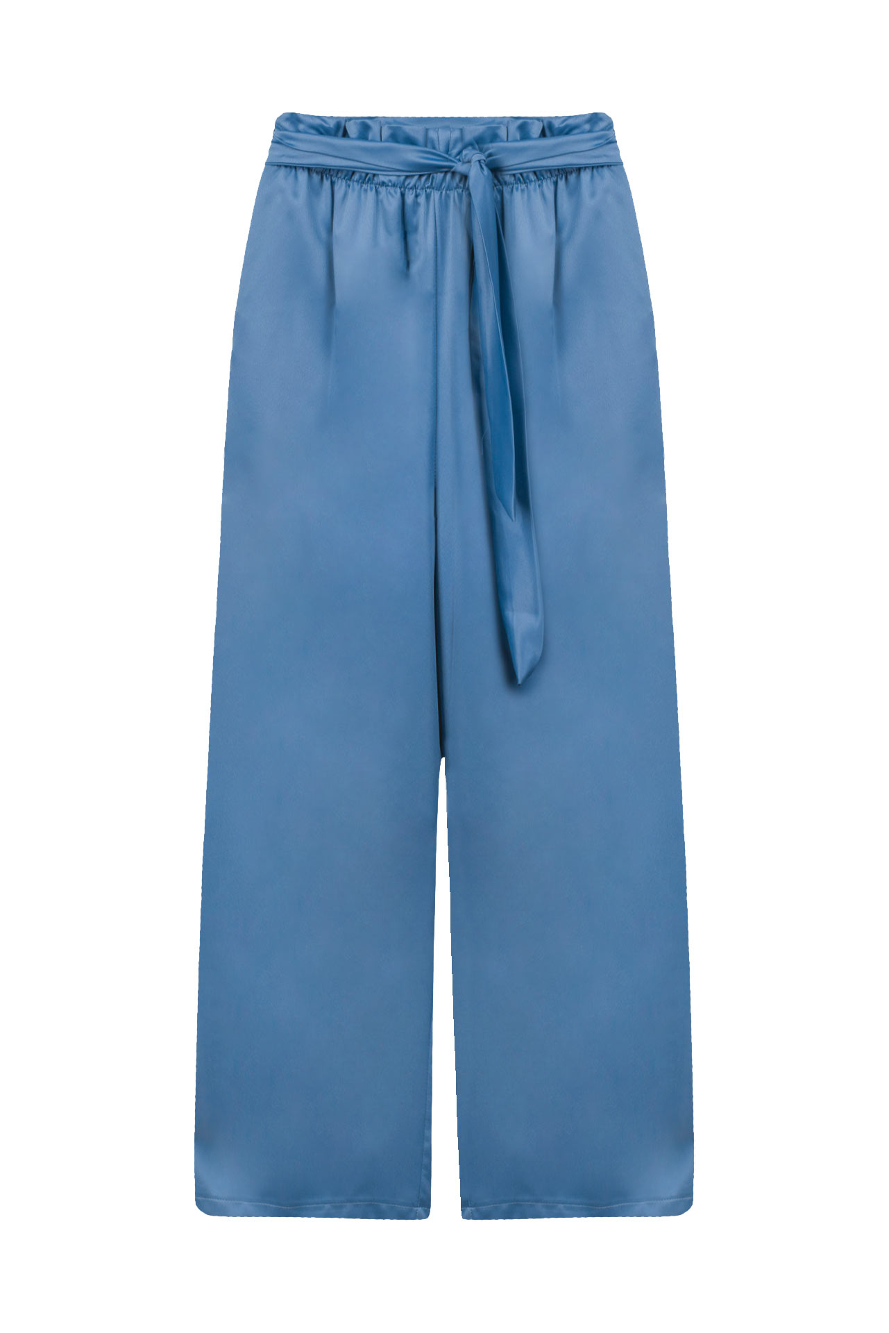 Calças de cintura subida elástica com efeito paperbag. Cinto de atar no mesmo tecido. Bolsos laterais. Corte de perna direita. Várias cores.