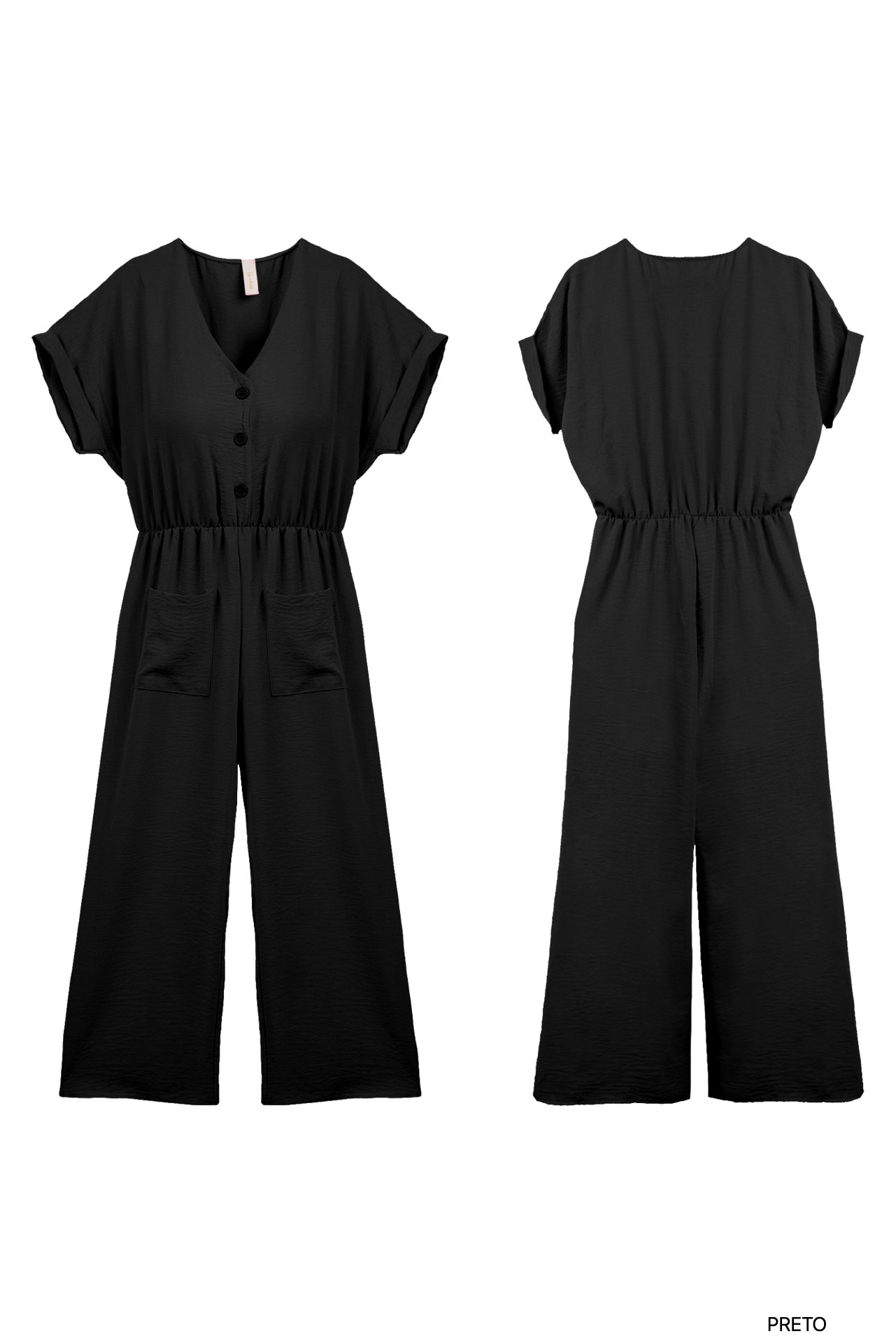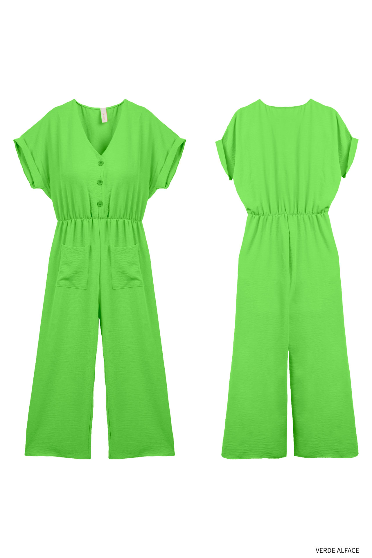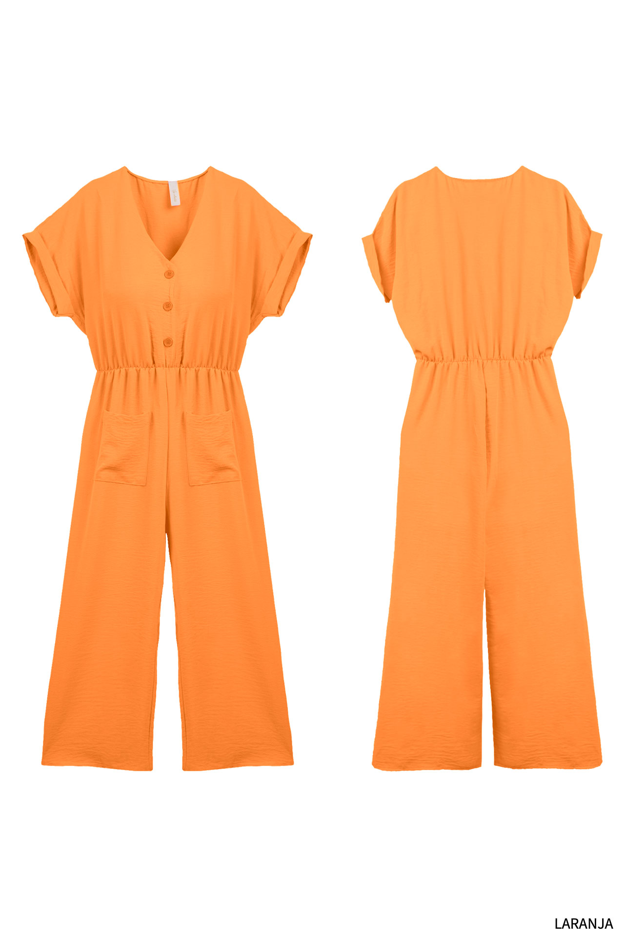 Macacão de manga comprida acabada em dobra. Decote em bico. Fecho frontal com botões. Bolsos chapa. Várias cores.