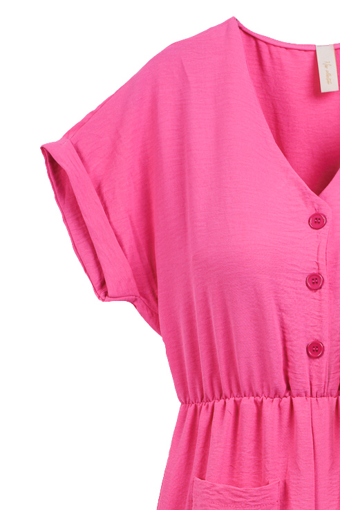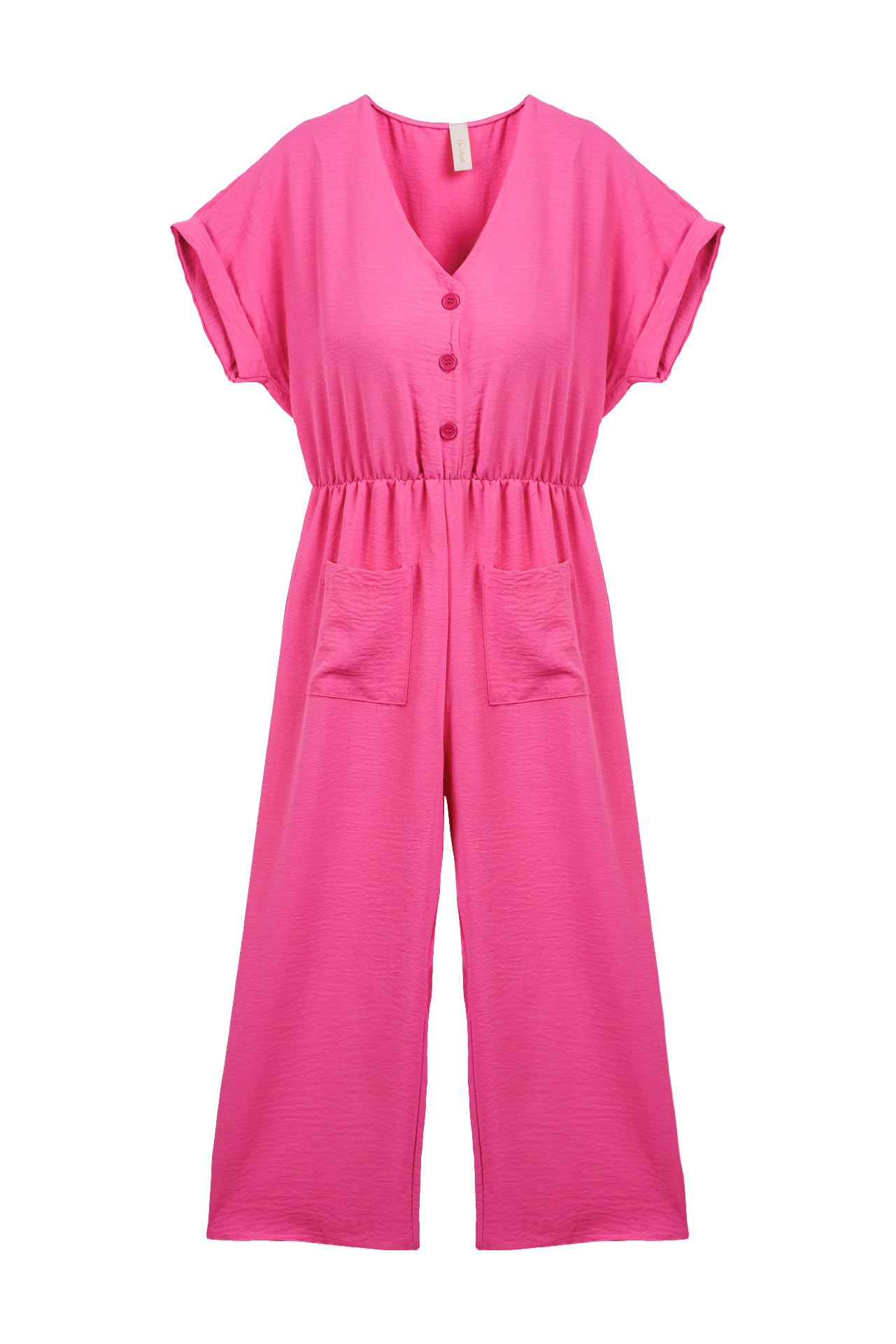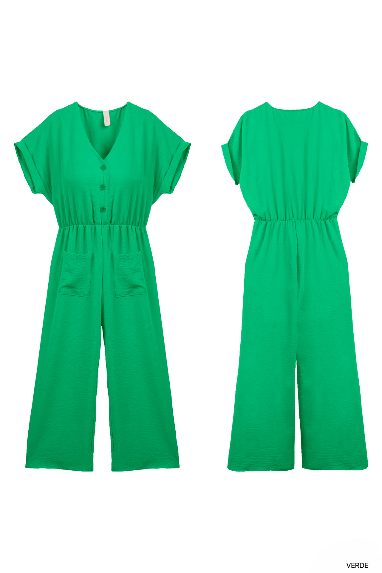 Macacão de manga comprida acabada em dobra. Decote em bico. Fecho frontal com botões. Bolsos chapa. Várias cores.